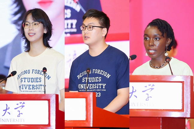 本科新生代表阿拉伯學(xué)院石莉莉以“北外的門”為主題表達(dá)了自己對北外精神的理解,并號(hào)召同學(xué)們打開熱愛的大門,打開世界的大門,打開回家的大門,永遠(yuǎn)牢記走出的大門。研究生新生代表亞洲學(xué)院張子言從自己的研究方向“印度社會(huì)文化研究”與所依托的梵語、巴利語出發(fā),思考當(dāng)代北外人的目標(biāo)與使命,號(hào)召同學(xué)們將小我與人類命運(yùn)共同體的偉大事業(yè)結(jié)合,發(fā)揮專業(yè)優(yōu)勢,播種新希望、放飛新夢想、踏上新征程。留學(xué)生代表、中國語言文學(xué)學(xué)院碩士生、來自肯尼亞的夏雨柔(NGUGI SHARON WANJIKU)在發(fā)言中回憶了學(xué)習(xí)中文的經(jīng)歷,希望通過在北外的學(xué)習(xí),將中華文化帶到家鄉(xiāng),弘揚(yáng)北外校訓(xùn)精神,為搭建中非溝通的友誼橋梁貢獻(xiàn)力量。