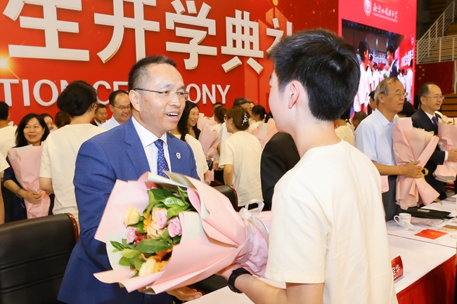 王定華為新生代表們佩戴校徽,并頒發(fā)校園卡。在場的全體新生一同佩戴校徽,正式成為“北外人”,肩負(fù)起“人民需要我們到哪里,我們就到哪里”的北外使命。