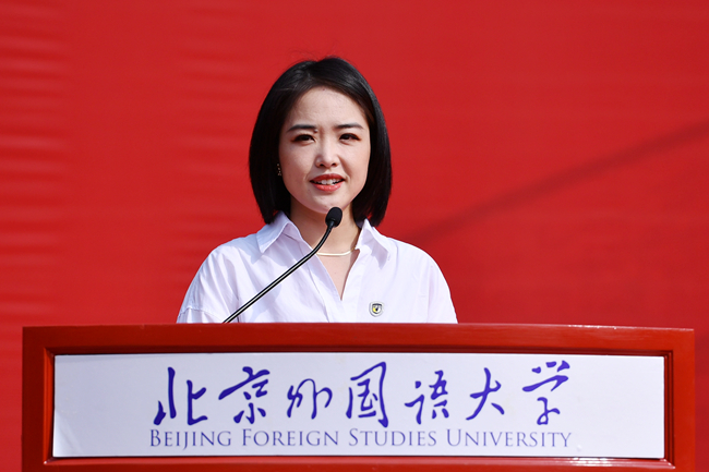 本科新生代表日語學院日語專業李子樂號召同學們以全新的面貌開啟人生新旅程,希望和同學們攜手奮進,做有理想、有本領、有擔當的北外人。英語學院英語筆譯專業政治文獻翻譯方向首屆新生、研究生新生代表李澤暉同學倡導同學們要“游于語言,依于北外,據于中國,志于世界”,將紅色基因不斷傳承,在偉大事業中綻放光彩。留學生代表、中國語言文學學院博士生、來自白俄羅斯的格里沙耶娃(Hryshayeva Katsiaryna)希望努力踐行“兼容并蓄、博學篤行”的校訓精神,成為有真才實學的北外人,為增進中白友誼貢獻自己的力量,希望和同學們一起為人類命運共同體建設做出更多貢獻。