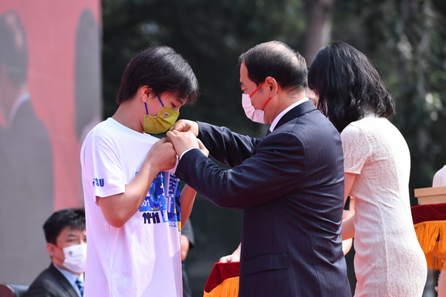 在神圣莊重的校徽佩戴儀式上,王定華為新生代表佩戴校徽、頒發新版北外校園卡。在場的全體新生同時佩戴校徽,正式成為北外人,成為北外大家庭的一員。