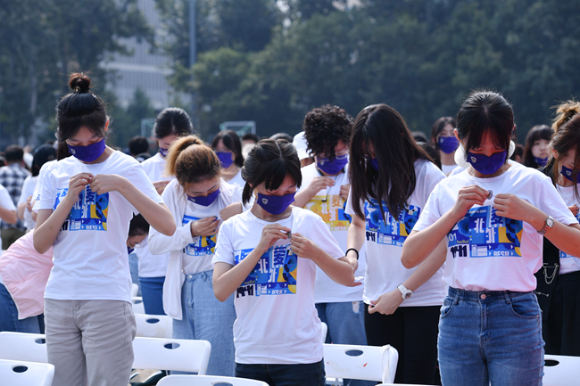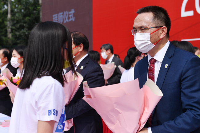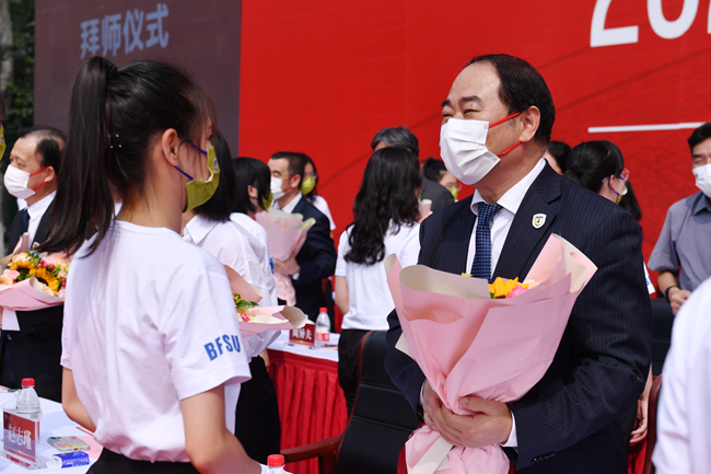隨后的新生拜師獻花儀式上,新生代表向教師代表鞠躬并獻上鮮花。學生代表帶領全體學生集體宣讀入學誓詞:銘記兼容并蓄、博學篤行的北外校訓,志存高遠,勤學力行。敬師愛校、誠以待人。強健體魄、陽光向上。珍惜韶華,奮發有為。胸懷天下,敢于爭先。不畏艱難,勇擔使命。服務人民,奉獻祖國。