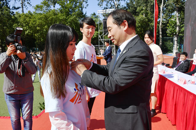 在神圣而莊重的校徽佩戴儀式上,王定華為新生代表佩戴校徽。在場的全體新生同時配帶校徽,正式成為北外人,成為北外大家庭的一員。