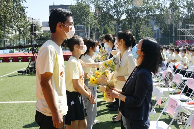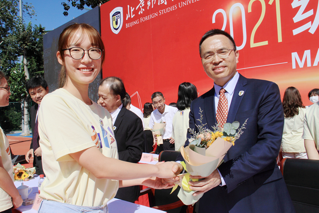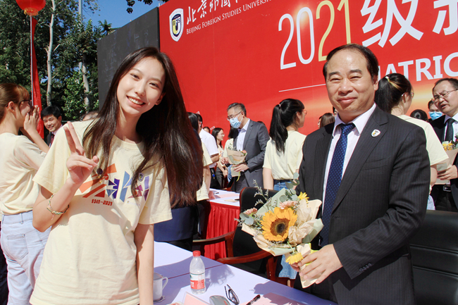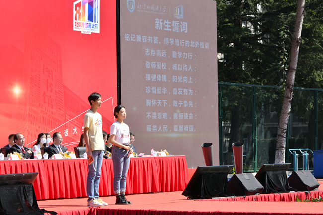 隨后的新生拜師獻花儀式上,新生代表向教師代表鞠躬并獻上鮮花。學生代表帶領全體學生集體宣讀入學誓詞:銘記兼容并蓄、博學篤行的北外校訓,志存高遠,勤學力行。敬師愛校、誠以待人。強健體魄、陽光向上。珍惜韶華,奮發有為。胸懷天下,敢于爭先。不畏艱難,勇擔使命。服務人民,奉獻祖國。