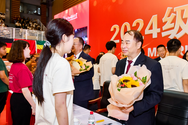 賈文鍵向2024級新生表示熱烈歡迎和祝賀,回顧了北外80余年的辦學(xué)歷史和發(fā)展成就。他指出,北外是座歷史悠久而又充滿活力的學(xué)府,生于反法西斯戰(zhàn)爭的烽火,成于新中國創(chuàng)業(yè)的磨礪,興于改革開放的春天,一磚一瓦承載著時間的印記,一草一木皆是時間浸染的風(fēng)華。當(dāng)你們邁入理想中的北外校園,就已經(jīng)開啟了新的人生階段。今天,你們以北外為自豪;明天,北外以你們?yōu)轵湴粒?/p>