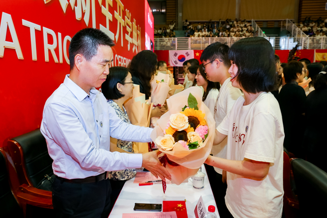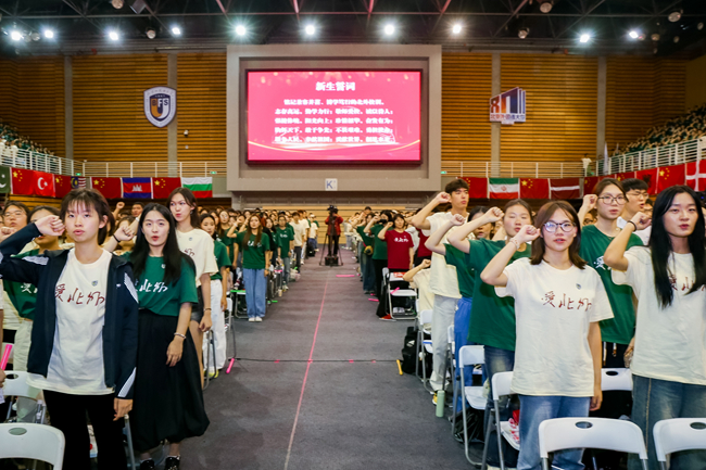 隨后,新生代表向在場教師代表鞠躬并敬獻(xiàn)鮮花,新生領(lǐng)誓代表帶領(lǐng)全體新生宣讀入學(xué)誓詞:銘記“兼容并蓄、博學(xué)篤行”的北外校訓(xùn),志存高遠(yuǎn)、勤學(xué)力行,敬師愛校、誠以待人,強(qiáng)健體魄、陽光向上,珍惜韶華、奮發(fā)有為,胸懷天下、敢于爭先,不畏艱難、勇?lián)姑?wù)人民、奉獻(xiàn)祖國,貢獻(xiàn)世界、創(chuàng)見未來。