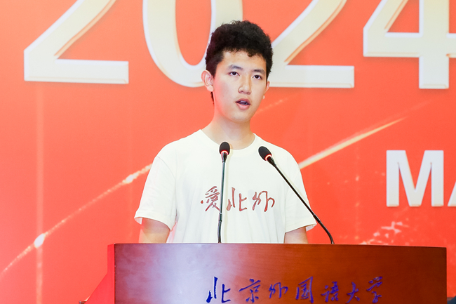本科新生代表、阿拉伯學(xué)院的祝令賀結(jié)合自身經(jīng)歷,從“從何而來、為何而來、如何書寫與北外的故事”三方面,闡述了對于全球化背景下外語專業(yè)的重要價值以及北外人肩負(fù)的時代使命的思考,號召同學(xué)們做勤奮求知的學(xué)習(xí)者、學(xué)以致用的實(shí)干家、志存高遠(yuǎn)的北外人,共同書寫與北外的嶄新篇章。