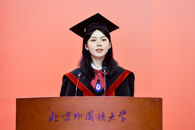 國際關系學院方蕓溪作為本科畢業生代表發言。她向師長的教誨、家人的陪伴、同學的鼓勵表達誠摯感謝,回憶了北外求學之旅對其職業理想的塑造。她表示,一代代北外人的故事激勵自己不僅要精于語言,更要心懷家國。在習近平總書記給北外老教授回信精神的指引下,結合在北外的學習經歷,她進一步堅定了自己投身國際傳播的決心,同時呼吁同學們秉承北外精神,為國效力,走向世界。