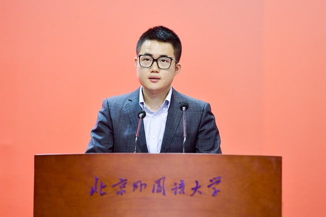 高級翻譯學院廖智超作為碩士研究生代表發言。他圍繞“路”這一意象,回顧了從家鄉啟程到北外經歷學術上的磨礪,到國際舞臺上以翻譯為媒介促進中外交流,再到海外學習拓寬國際視野這一路走來的種種,表示在北外的學習激發了自己勇于探索、不斷超越的追求。他呼吁同學們積極選擇挑戰之路,不忘初心,勇擔時代使命,為促進全球理解與構建人類命運共同體作出不懈努力。